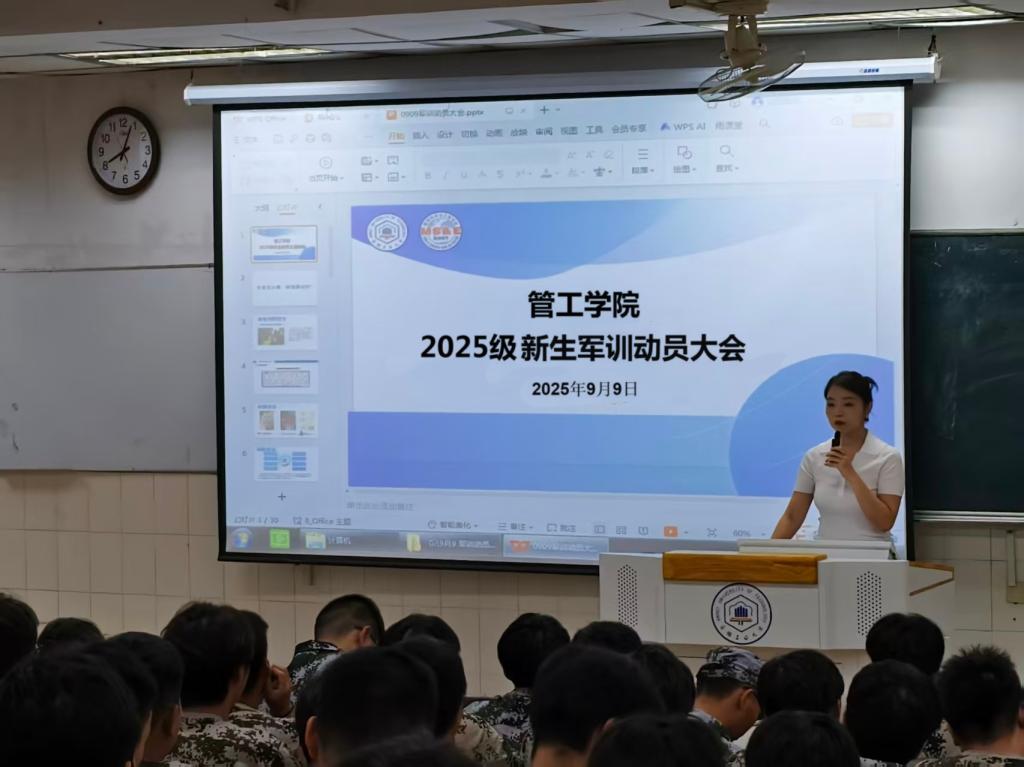 为进一步明确军训意义、强化纪律意识、凝聚集体精神,以昂扬姿态迎接入学后的第一课,9月9日上午,管工学院在东阶101教室组织召开2025级新生军训动员大会。院党委副书记、纪委书记、副院长赵颖,新生辅导员李思雨及全体2025级本科生参加了本次动员会。