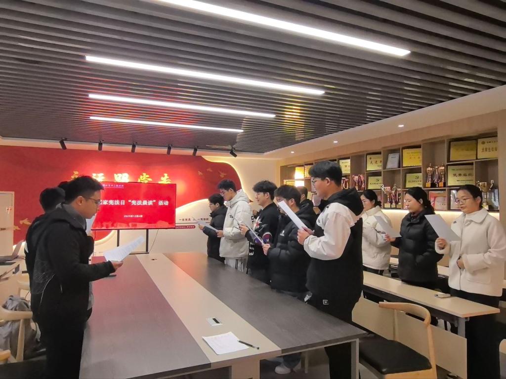 活动中,各年级学生代表集体观看全国青少年普法网专题直播,跟随领读诵读宪法核心内容,重点学习中国特色社会主义法律体系框架、公民常用法律知识,以及与大学生密切相关的民事权利、劳动权益、知识产权保护、纠纷解决机制等内容。随后,全体成员共同唱响《宪法伴我们成长》。活动结束后,同学们纷纷表示,通过本次学习,对宪法的核心要义与实践价值有了更深刻认识,进一步提升了法律素养与社会责任感,并承诺将在日常学习与生活中自觉践行宪法精神,做宪法的忠诚崇尚者、自觉遵守者和坚定捍卫者。