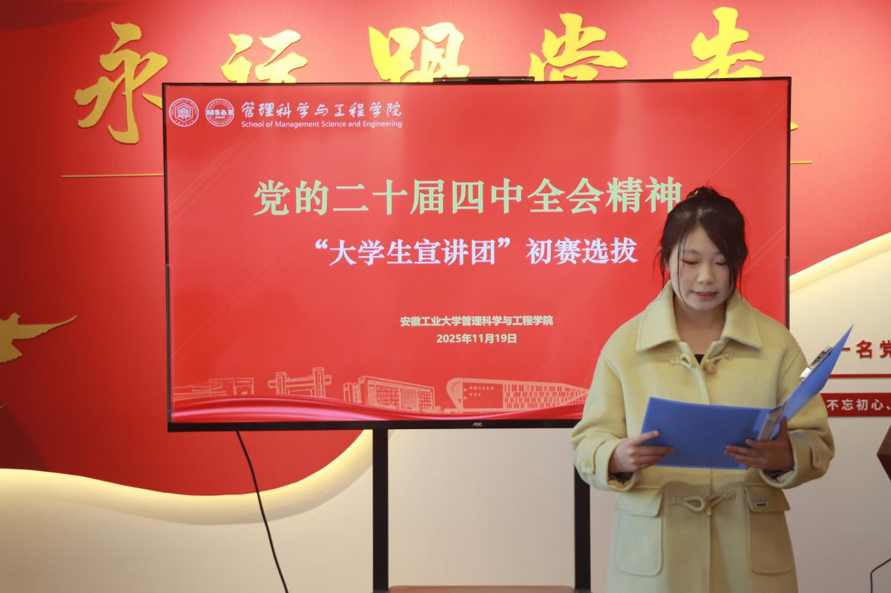 在汇文楼A502举办党的二十届四中全会精神“大学生宣讲团”院级选拔赛。2024级辅导员李军慧、2025级辅导员李思雨担任评委。