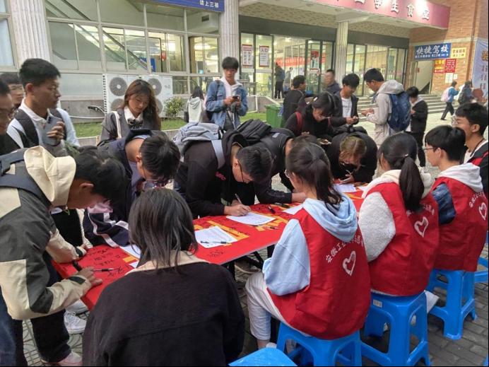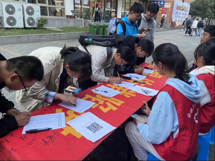 在活动前期线上线下广泛宣传的基础上,活动现场志愿者们以形式多样的方式向同学们介绍电信网络诈骗高发案件类型、危害与防范措施,并结合鲜明的案例进行说明。同学们听完理性消费、反诈防贷的宣讲后自发主动地在横幅上签名。