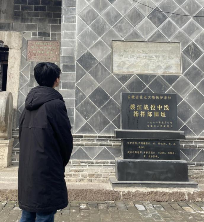 怀着这份心情,团队到达了下一站——渡江战役中线指挥部旧址。渡江战役指挥部旧址在枞阳的老街,,因而四周安静、肃穆。旧址的屋子上,斑驳的石刻,在诉说着历史的厚重。走进旧址,大家被里屋里一艘巨大但是看起来破旧的船吸引了目光。透过这艘船,可以想象当时渡江战役的激烈战况,体会到革命前辈的不易。旁边陈列的照片、背景介绍与诗词中,一篇《勇渡天堑》详细记录了在枞阳渡江战役的全过程,实践队员们都认真研读了这篇文章,做好了相关记录,其中一句“一举过得渡江战役的全面胜利”,让大家产生了强烈的民族自豪感,我们在铭记、感怀历史的同时也要接过前辈手中的接力棒,承担起身为国家新一代接班人的职责,不忘初心,砥砺前行。
