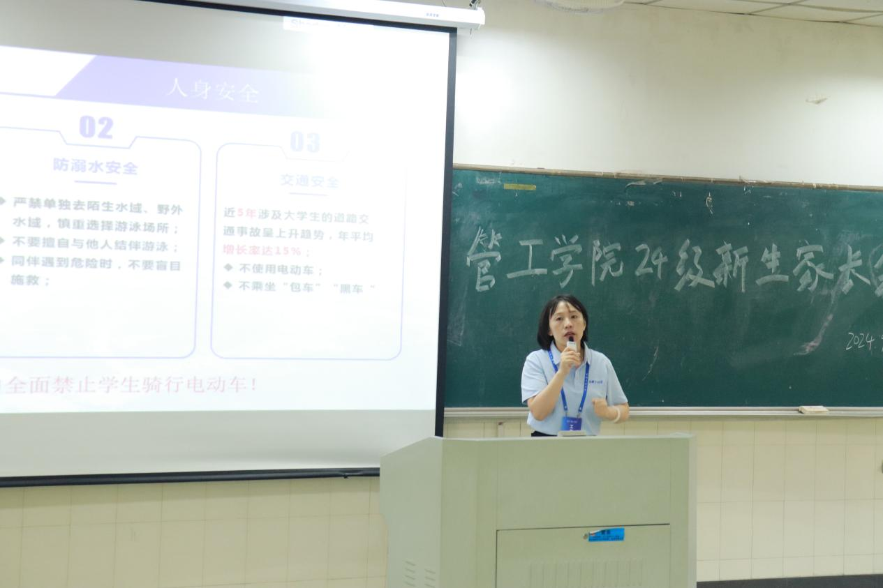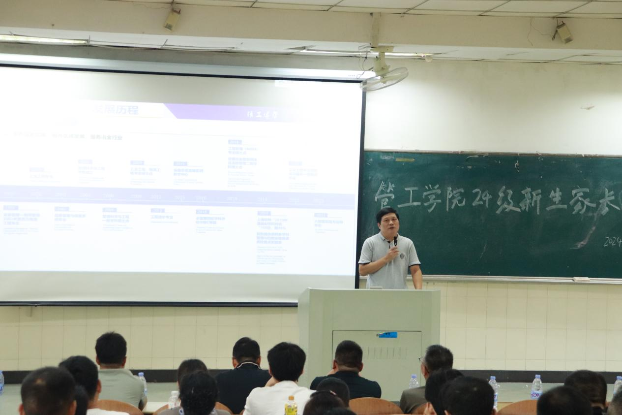 在阶教101召开了2024级新生家长见面会。管工学院领导班子、系室主任、2024级班主任、辅导员以及全体新生家长参加本次会议。会议由院党委副书记、副院长、纪委书记赵颖主持。