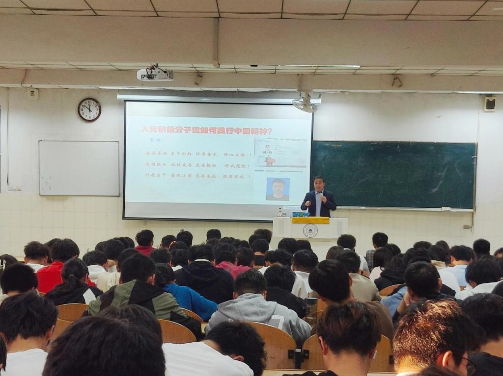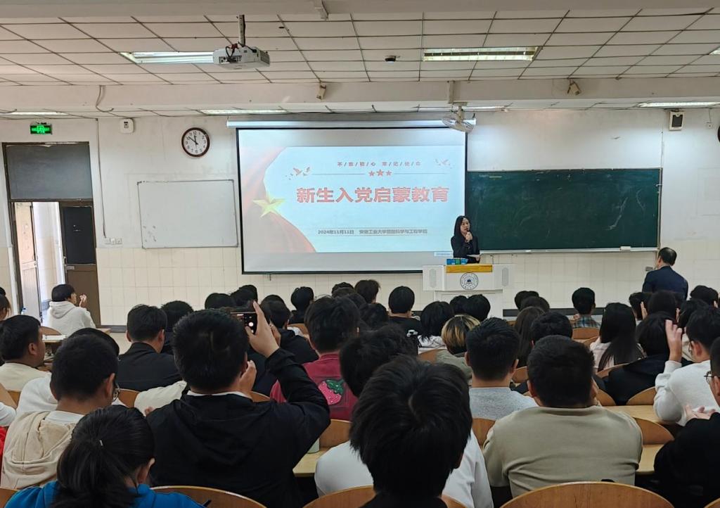 于阶教101开展2024级新生入党启蒙教育,能源与环境学院凤杰老师主讲,会议由学院党委副书记、副院长、纪委书记赵颖主持,2024级全体学生参与。