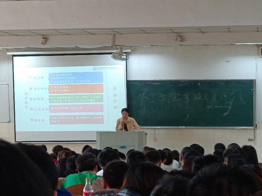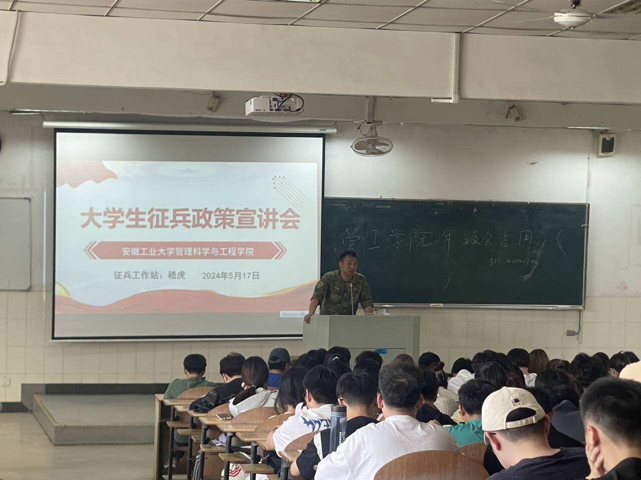 于阶教101召开2024届毕业生年级会暨2024年秋季征兵动员宣讲会。校征兵工作站嵇虎老师,管工学院2020级辅导员李军慧以及2020级毕业班全体同学参与本次会议。会议由毕业班辅导员李军慧主持。