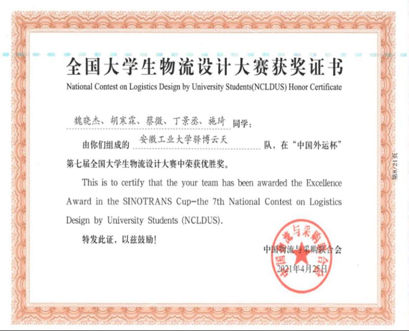 物流工程183班团支书,曾担任2020-2021届管工学院学生会主席。曾获得国家级奖项3项、省级奖项3项,发表论文1篇,主持国家级创新创业项目1项。于2021年9月推免至苏州大学轨道交通学院。