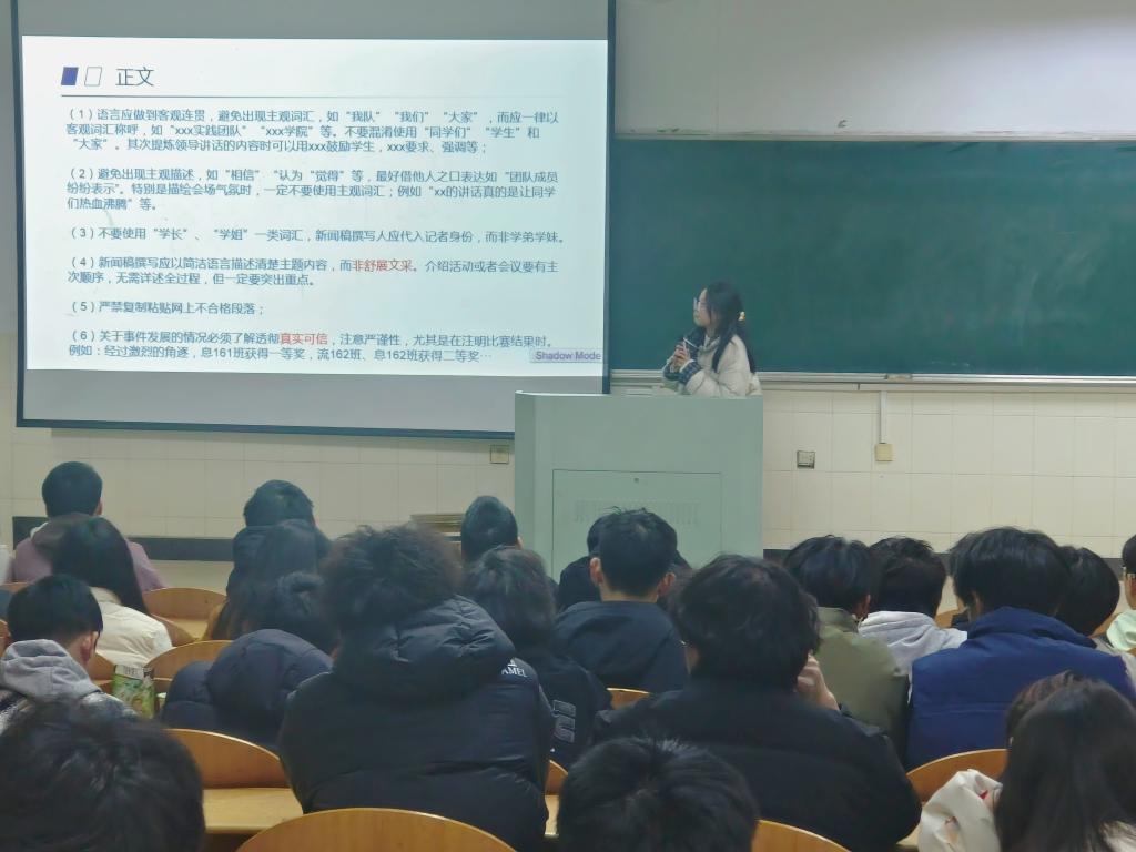 会上,编辑部司佳妮介绍了新闻稿的基本要素与撰写要领,指出新闻稿应遵循的基本原则,并以案例分析的方式列举稿件撰写中的常见误区及对应修改建议,提升学生对新闻写作的规范认识。记者团李少斌从合影、观众、活动全景与人物特写四类常见场景入手,重点讲解了照片拍摄的相关要求,并现场演示拍摄方法。新媒体部张梦缘聚焦图文排版,从排版设计的六大要素出发,强调图文推送要遵循色调统一、主次分明、信息清晰、风格简约的核心原则,并结合学院微信公众号的推送内容,重点分享了色彩搭配技巧。