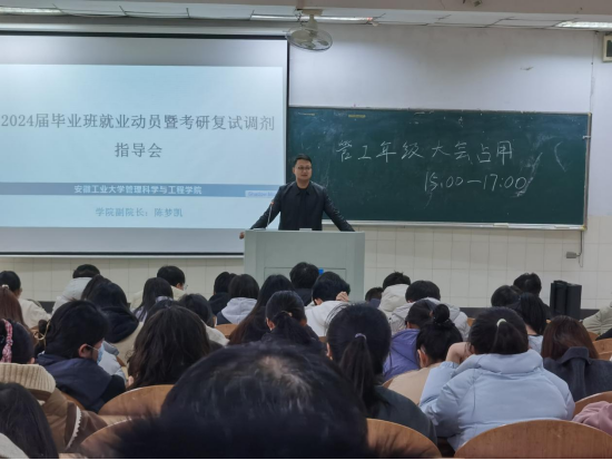 3月14日下午,管工学院在阶教101召开考研复试专题指导会暨2024届毕业班就业动员会。学院副院长陈梦凯、毕业班辅导员杨金星、李军慧以及全体毕业班同学参加本次会议,会议由杨金星主持。