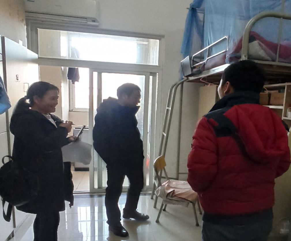 冬季是感冒流感等呼吸道疾病的高发季节,疫情当前,进一步落实学校疫情防控常态化工作,充分了解研究生生活学习情况,加强宿舍安全管理,12月9日、15日上午,管工学院党委副书记王功成、副院长王付宇、辅导员杨卫玲及各班班委深入研究生宿舍,开展宿舍卫生安全大检查。