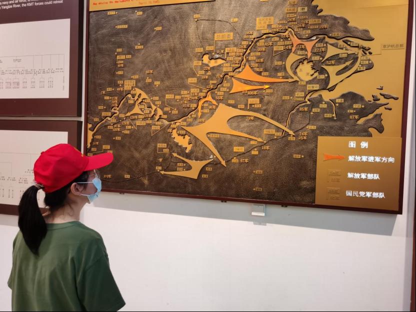 图为团队成员在观看研究渡江战役前敌我态势及我军作战决心图。