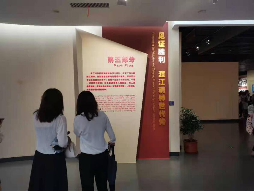 走进渡江胜利纪念馆。馆内珍藏着丰富的文物和史料文献,展示了许多渡江战役历史珍贵文物资料,如照片、图表、复制品、实物等,还有战士们曾使用过的望远镜、指南针、军大衣、毛毡等物品,馆内甚至还珍藏了许多缴获的枪支武器,分展现了渡江战役取得胜利的全过程,让成员有身临其境的代入感。
