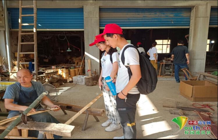 图为实践队员观看工人制作竹编的“破竹”工艺,把竹筒破成一定规格宽窄竹片。中国青年网通讯员 周全球 供图