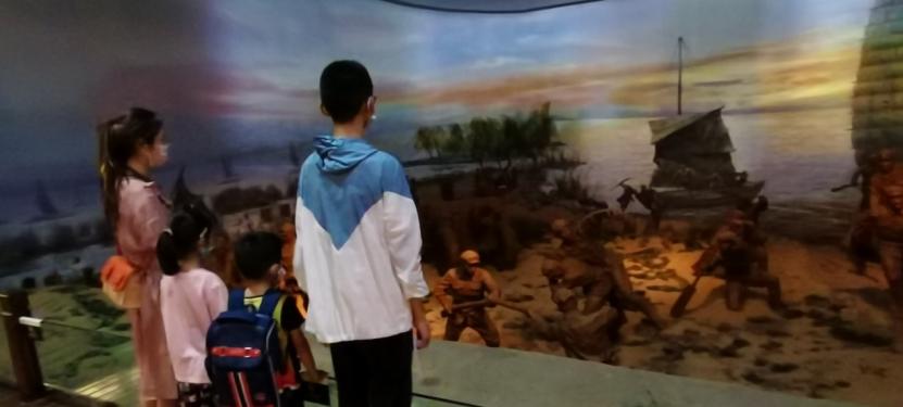 图为实践队员正在认真观看模拟先烈在巢湖练兵的场景。