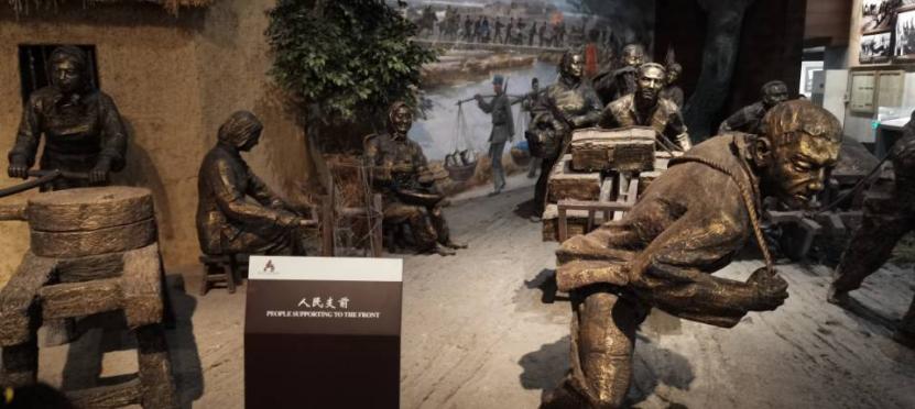 图为反映当地居民为战前军人准备粮食、运送物资的雕像。