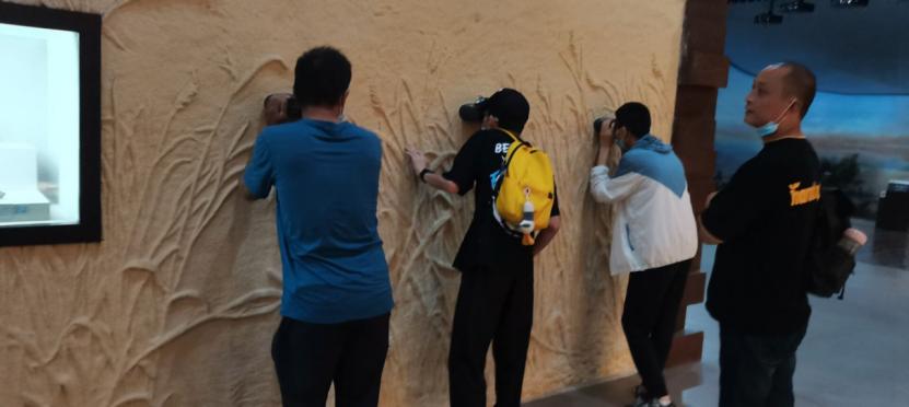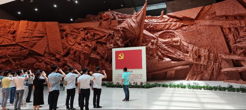 图为实践队员恰遇预备党员在馆内“百万雄师过大江”浮雕前进行入党誓词。