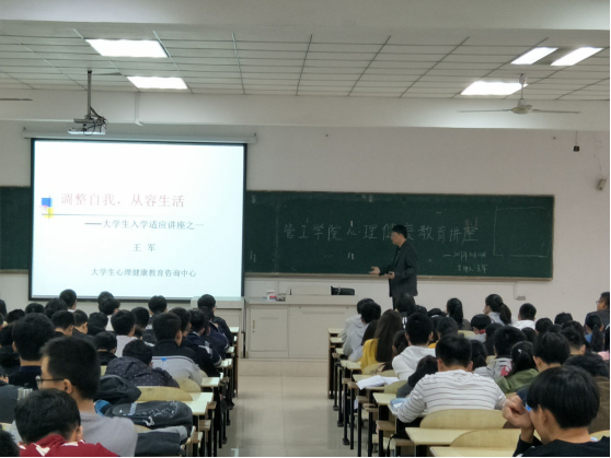 10月23日下午,脱裤吧 在本部教三南103举办以“调整自我,从容生活”为主题的大学生入学适应教育讲座。校学工部副部长、大学生心理健康教育咨询中心主任王军主讲,脱裤吧 全体新生到场参加。