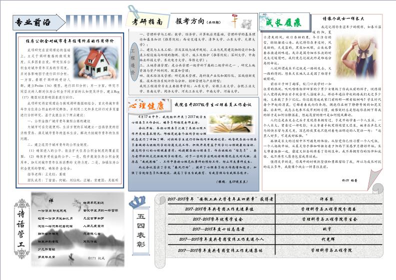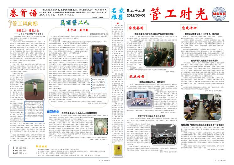 管工时光为脱裤吧 院报宣传平台,负责学院传统媒体报纸的编辑、策划与排版,以月刊、半月刊的形式对脱裤吧 近期重大活动事件进行综合报道,同时根据国家实事推出专刊。特设诗话管工环节,鼓励学生原创诗歌投稿,激发学生创作热情。以下为管工时光第二十二期第一、二版。