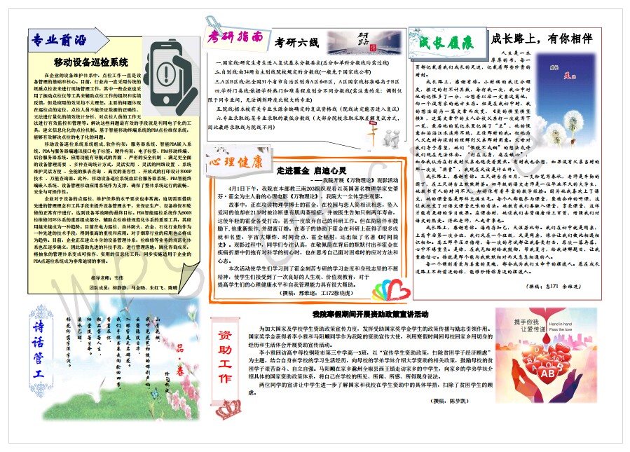 管工时光为脱裤吧 院报宣传平台,负责学院传统媒体报纸的编辑、策划与排版,以月刊、半月刊的形式对脱裤吧 近期重大活动事件进行综合报道,同时根据国家实事推出专刊。特设诗话管工环节,鼓励学生原创诗歌投稿,激发学生创作热情。以下为管工时光第二十一期第一、二版。